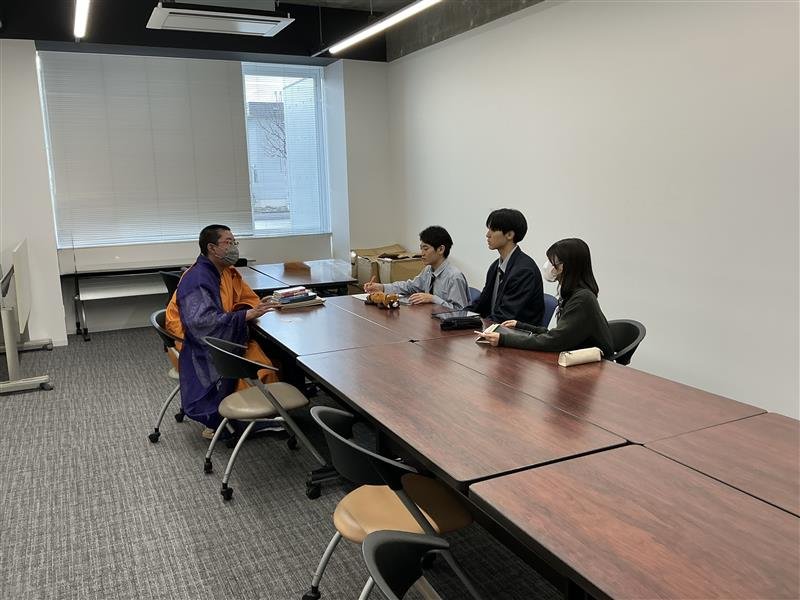 お寺の住職さんに取材を希望していた班がありましたが、お寺の付近に熊が出る危険性があるということで、わざわざ住職さんが学校まで来てくれました。