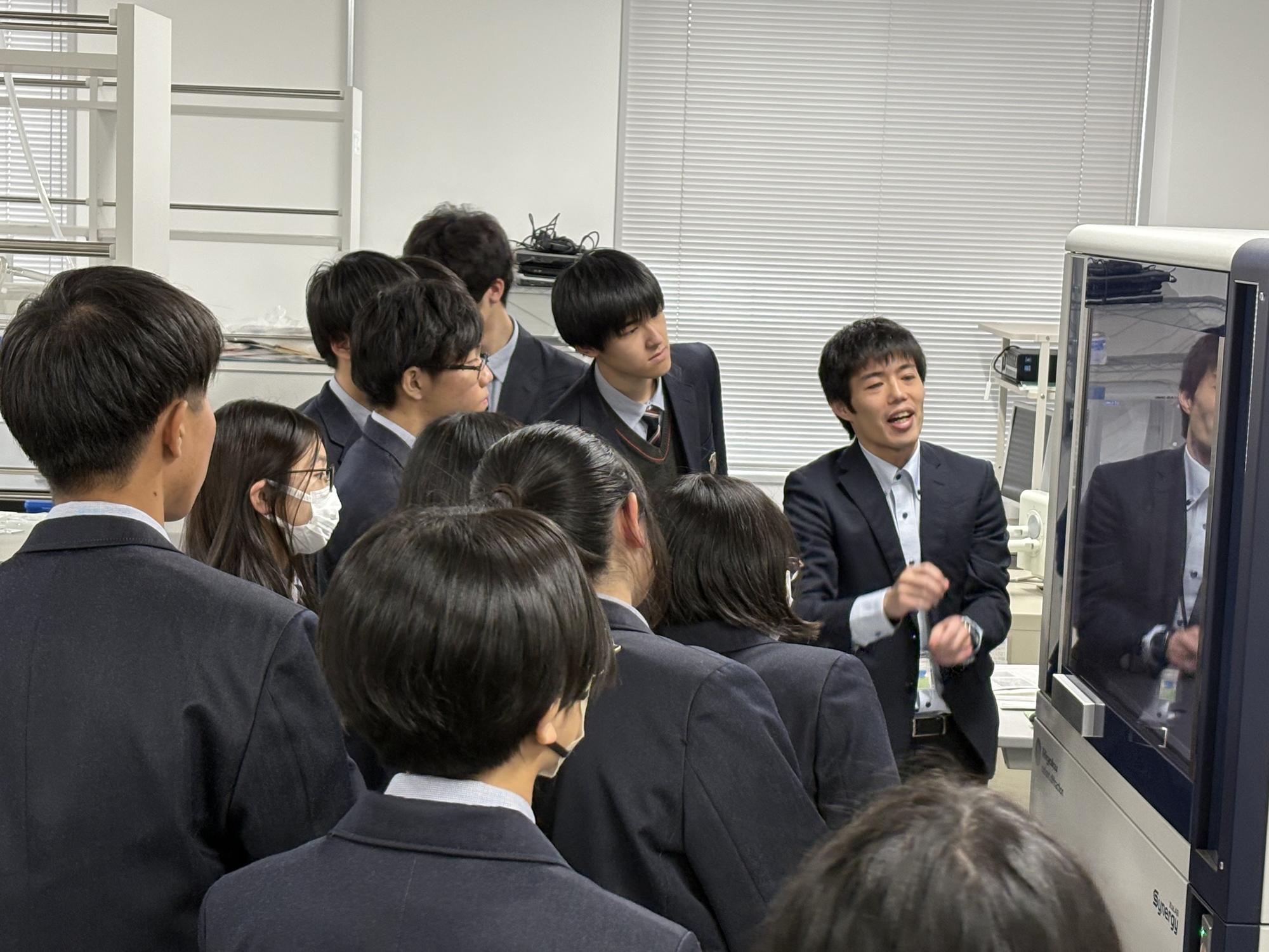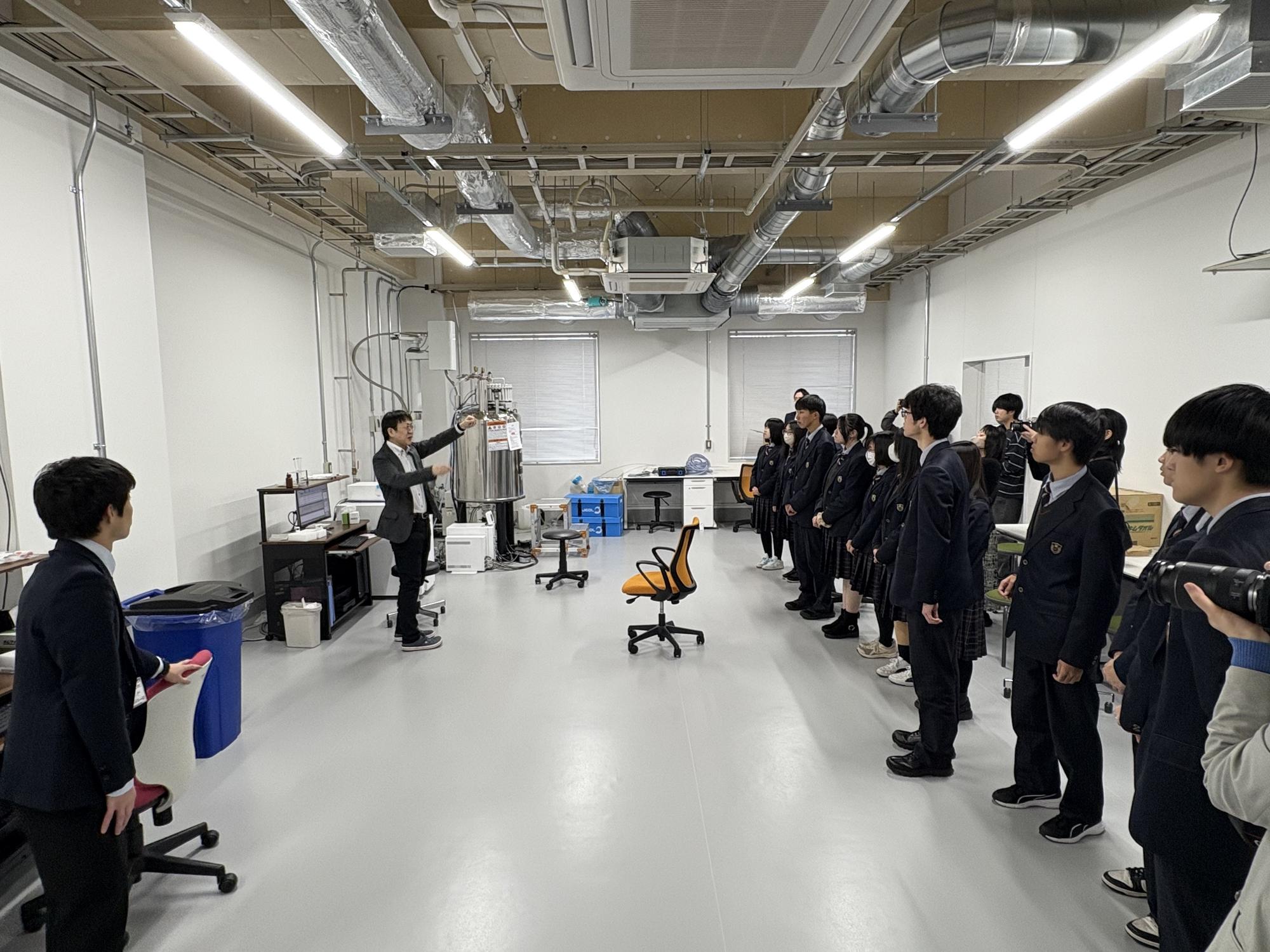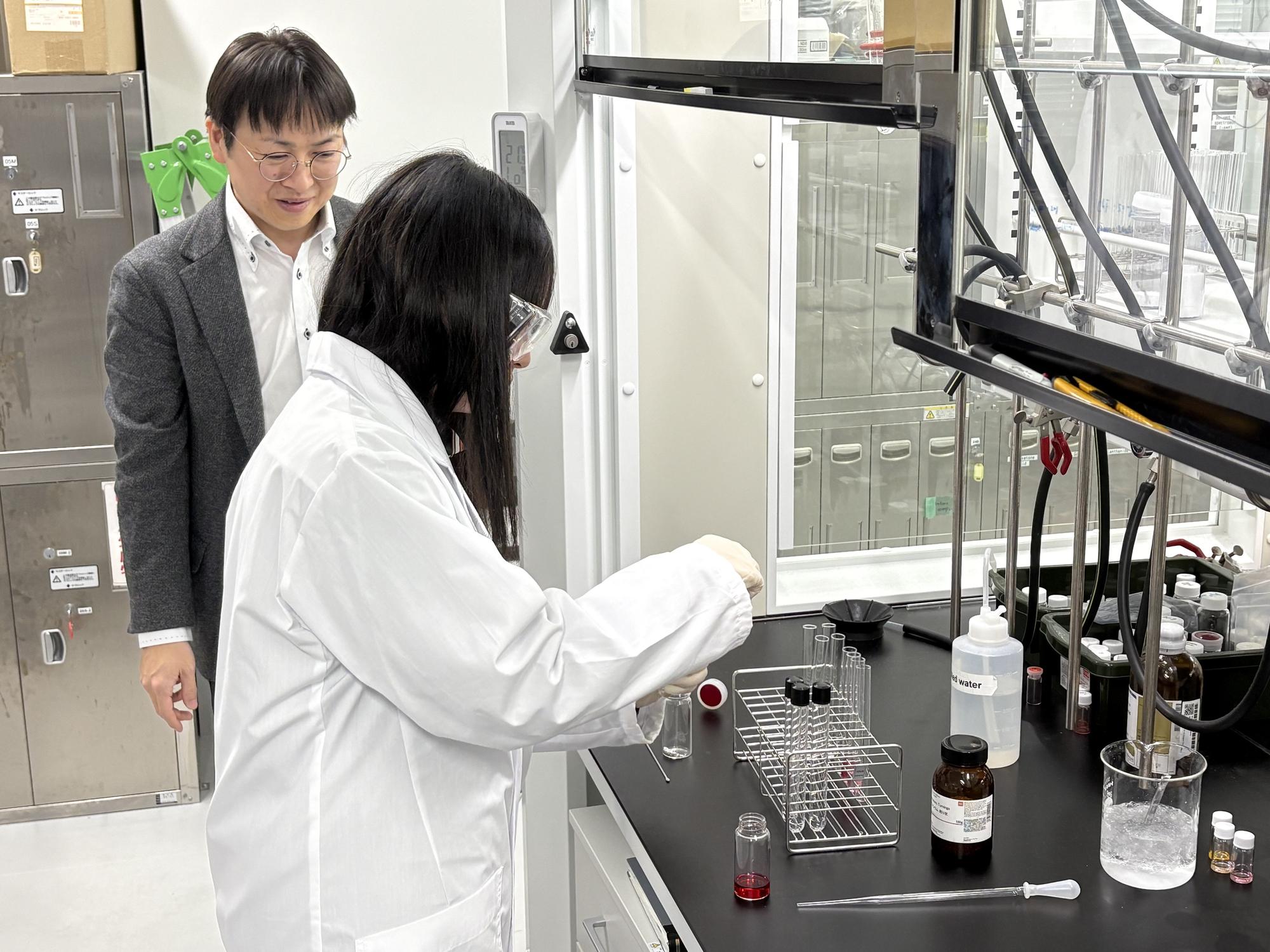 見学後は白衣を身に着け、2つの体験学習に挑戦。1つ目は、
