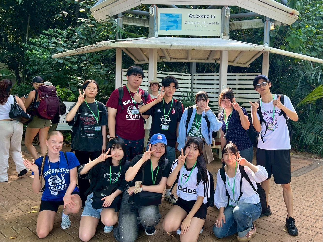 最終日は、ケアンズ沖に位置するグリーンアイランドを訪れました。浅瀬のエメラルドグリーンと外洋のサファイアブルーのコントラストが非常に美しい海を眺めながらの45分の船旅です。到着後は、船底がガラス張りになったボートに乗船し、サンゴ礁や熱帯魚に加え、現地でもなかなか見ることのできないサメやウミガメの姿を運良く間近で観察することができました。その後は、ビーチで食事をし、景色を楽しんだり写真を撮ったりするなど、自由時間を過ごしました。また、ワニが餌を食べる様子を見学できる施設もあり、オーストラリアならではの体験となりました。留学最終日にふさわしく、自然に触れながら心身をリラックスさせる時間となり、生徒たちも大変満足した様子でした。