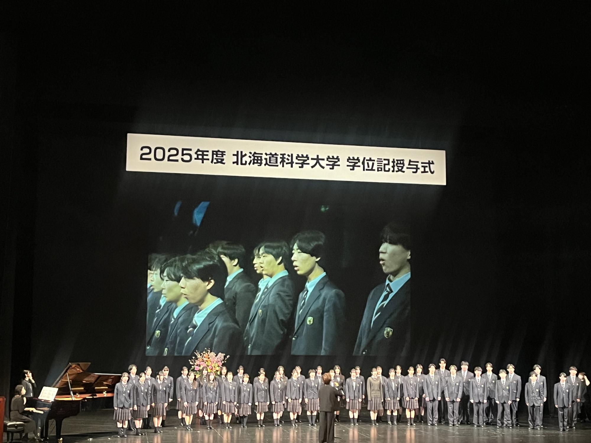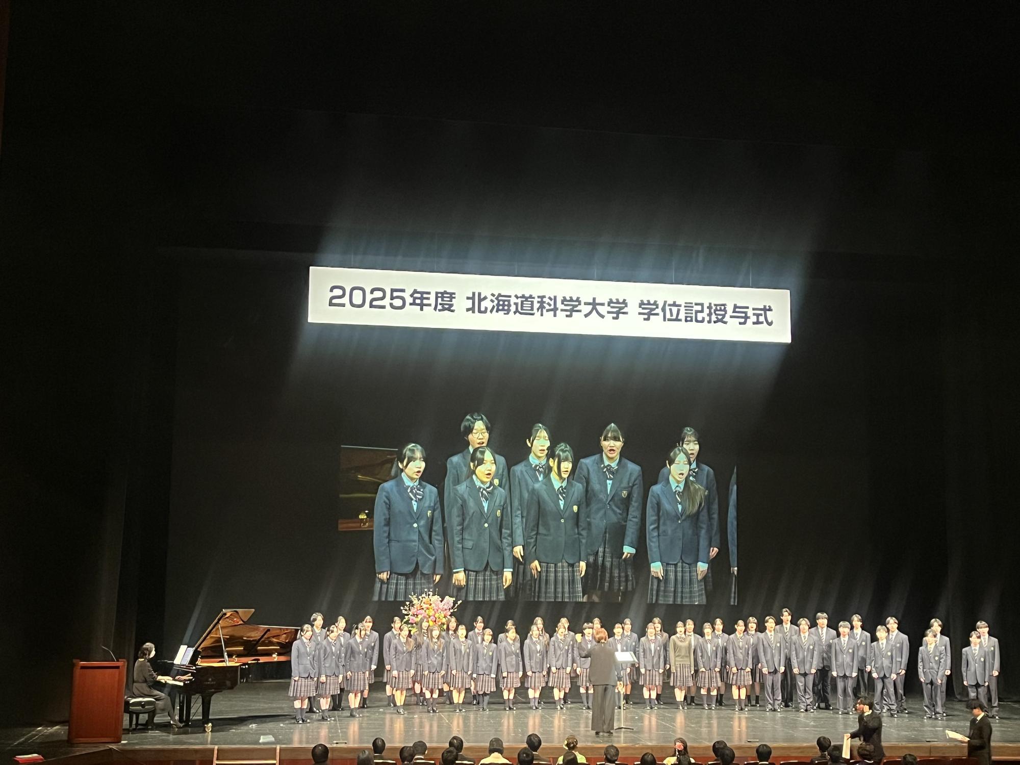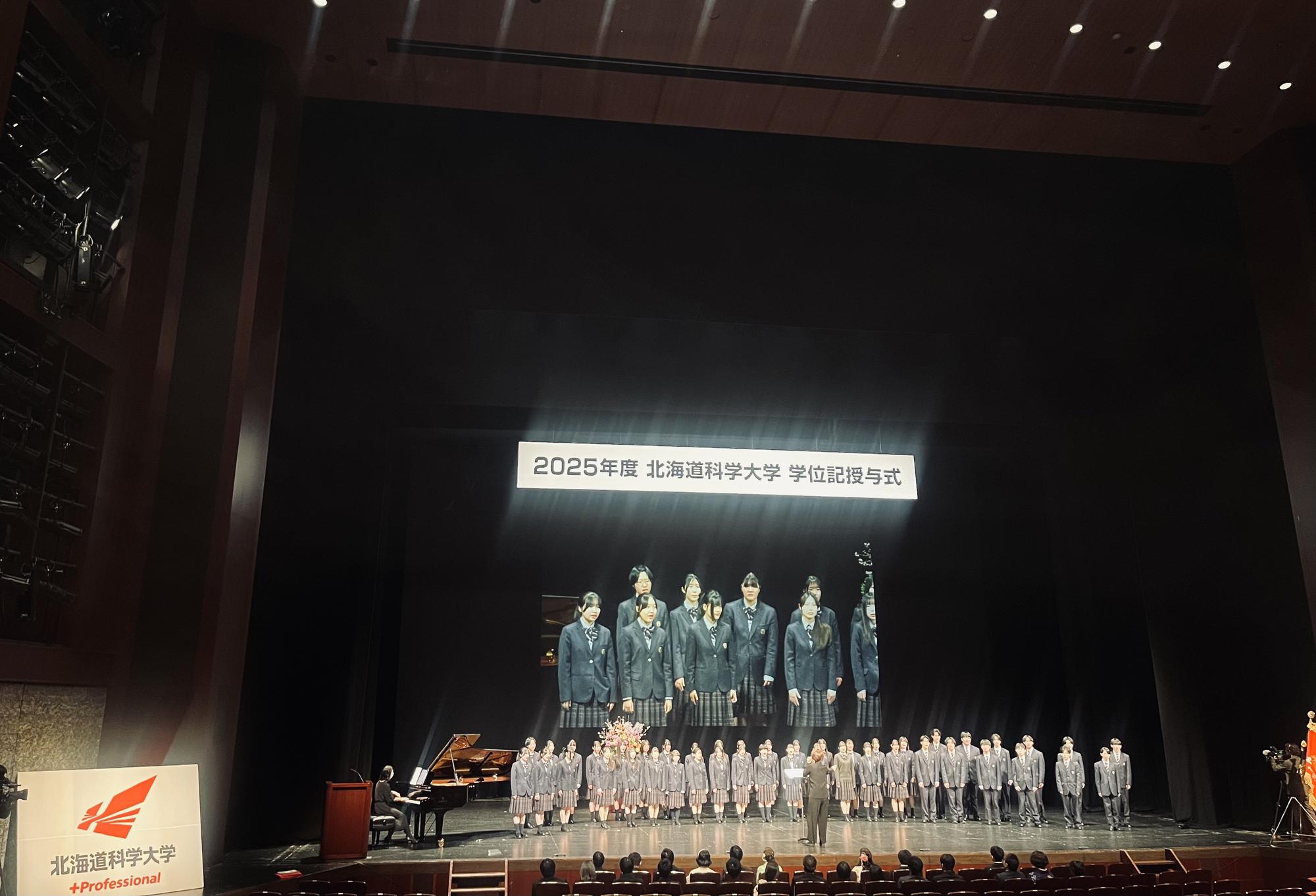生徒の活躍 2026年03月30日 【合唱部】北海道科学大学 学位記授与式に出演しました 合唱部は3月18日に札幌文化芸術劇場hitaruで行われた北海道科学大学の学位記授与式に出演しました。校歌のほか、新たな道を歩むみなさんに送る曲として、GReeeeN(グリーン)の「遥か」を演奏しました。北海道科学大学の卒業生のみなさんの今後の人生がすばらしいものになるよう、合唱部一同、心からお祈り申し上げます。 この記事をSNSでシェア